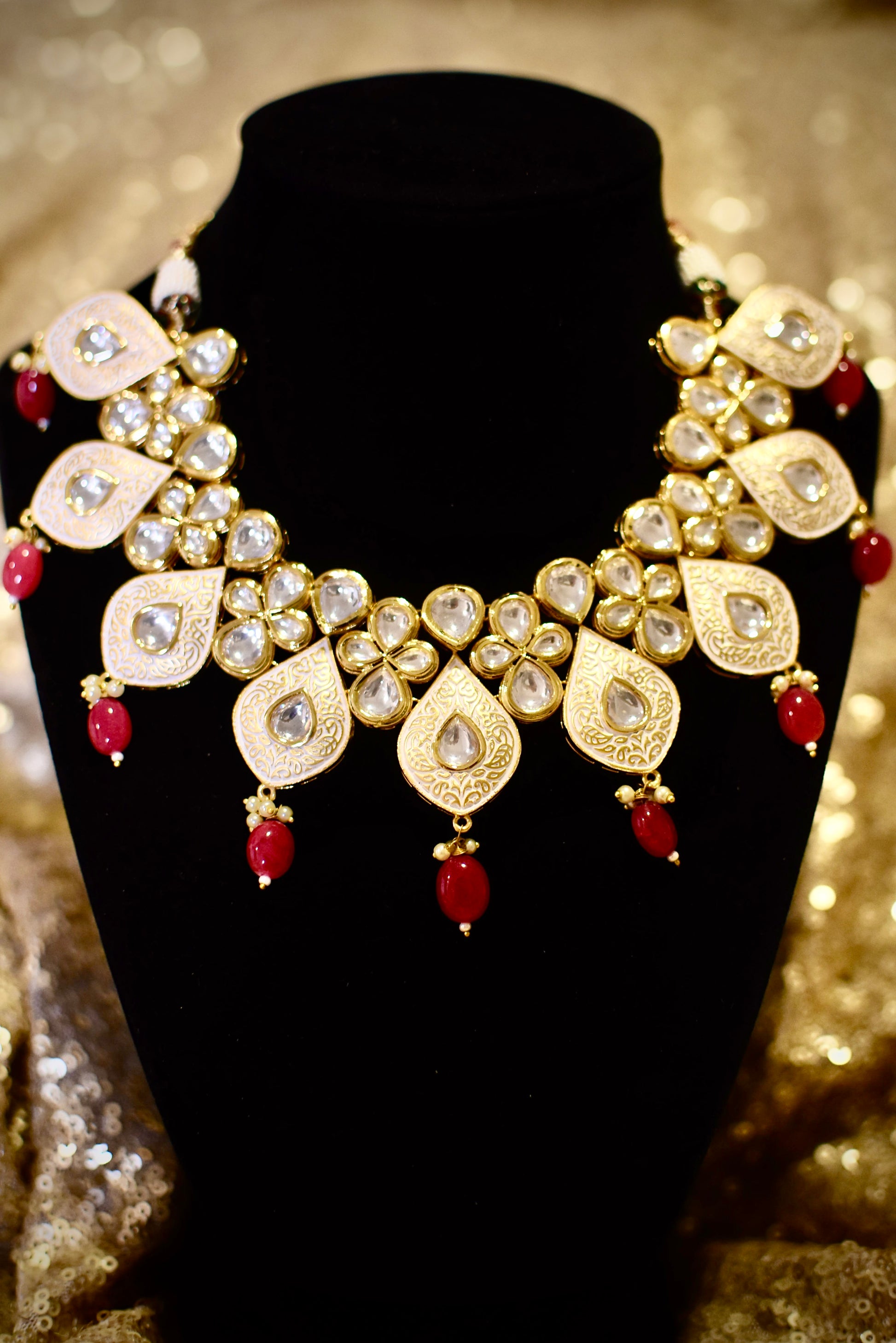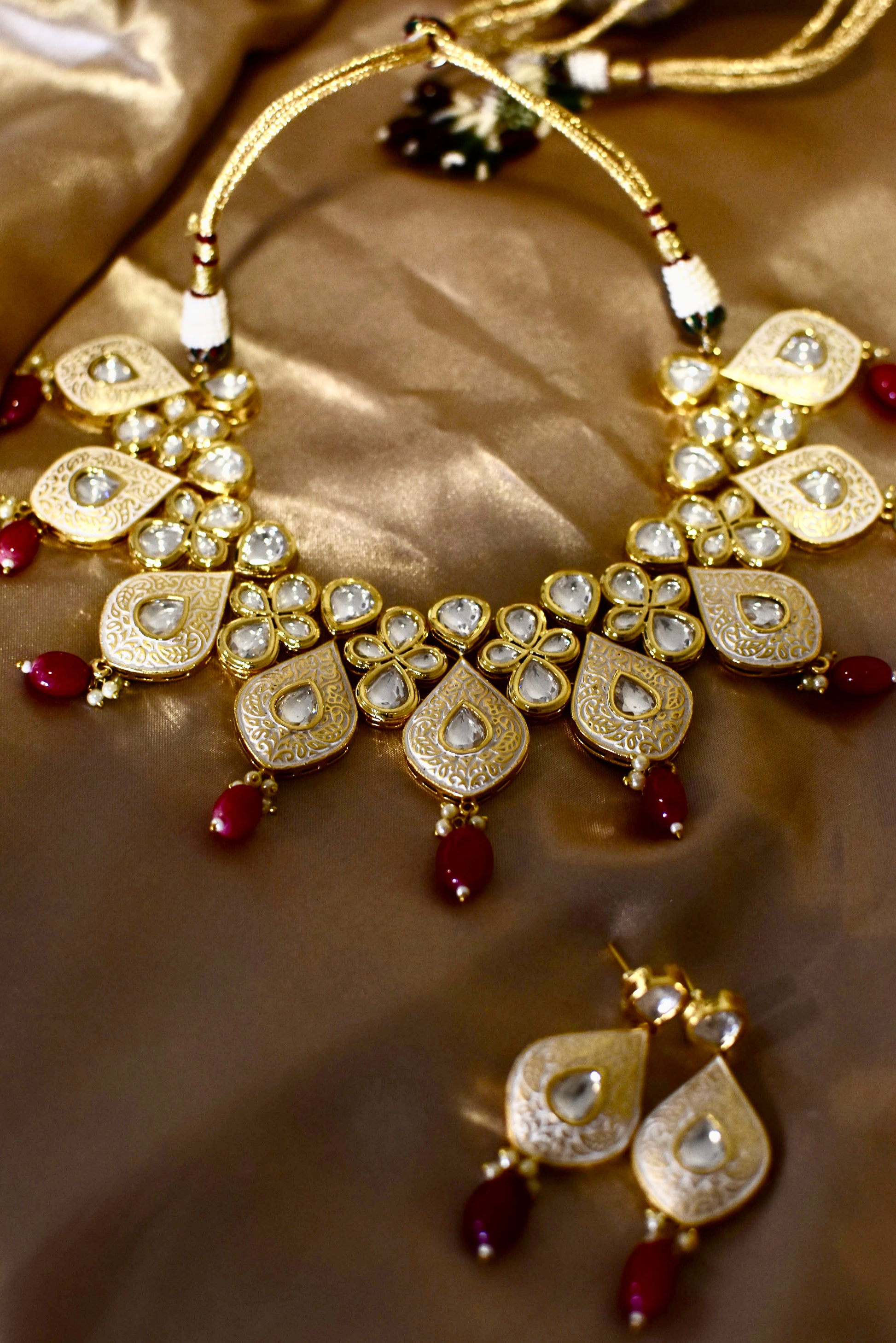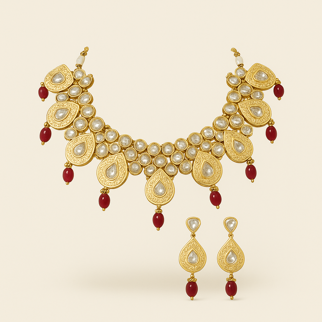 Handcrafted by master artisans, this exquisite set features premium polki-style kundan stones framed in intricate hand-etched meenakari detailing. The necklace’s cascading teardrop motifs are adorned with deep ruby drops, adding a bold, royal contrast against the luminous mirror-polished stones.