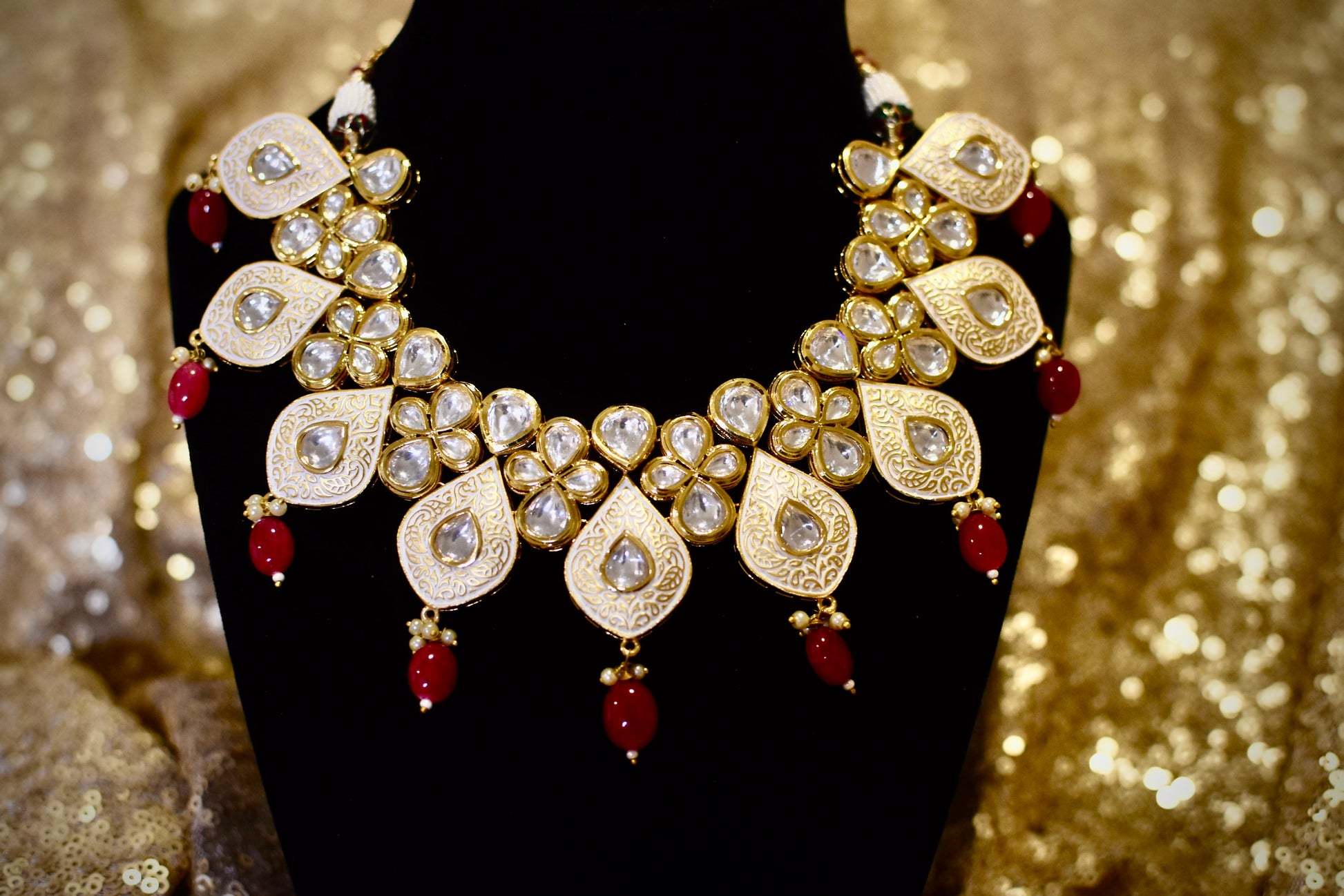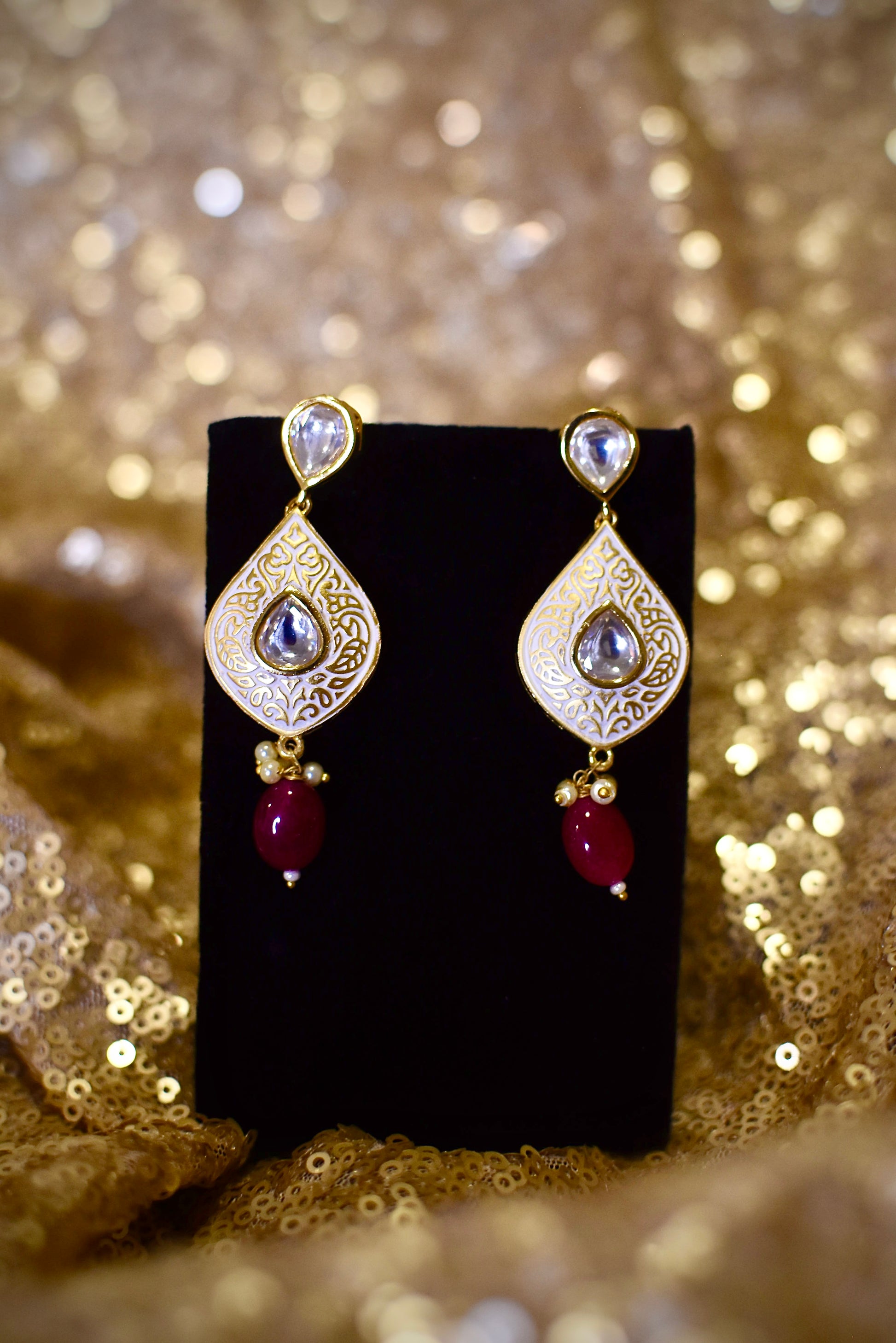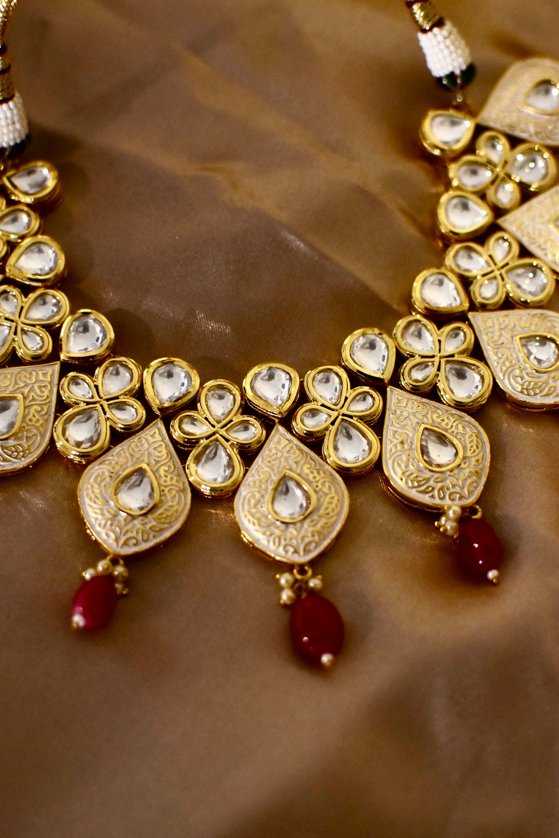 Handcrafted by master artisans, this exquisite set features premium polki-style kundan stones framed in intricate hand-etched meenakari detailing. The necklace’s cascading teardrop motifs are adorned with deep ruby drops, adding a bold, royal contrast against the luminous mirror-polished stones.