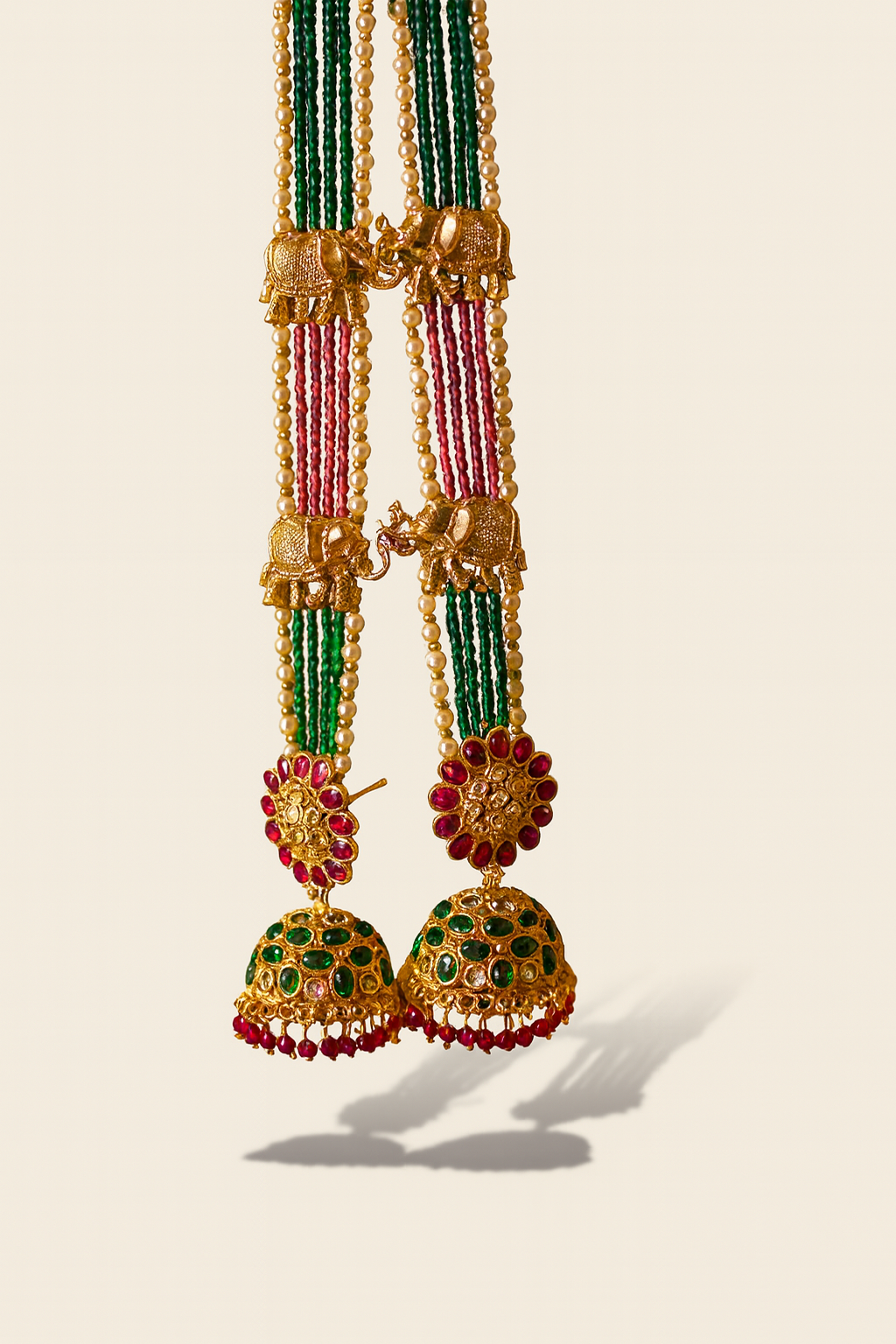 Introducing Meerab, the epitome of luxury inspired by the opulence of the Mughal era. These antique gold plated earrings feature a delicate long chain and are adorned with vibrant gemstones, adding elegance and sophistication to any outfit. Make a statement with Meerab.