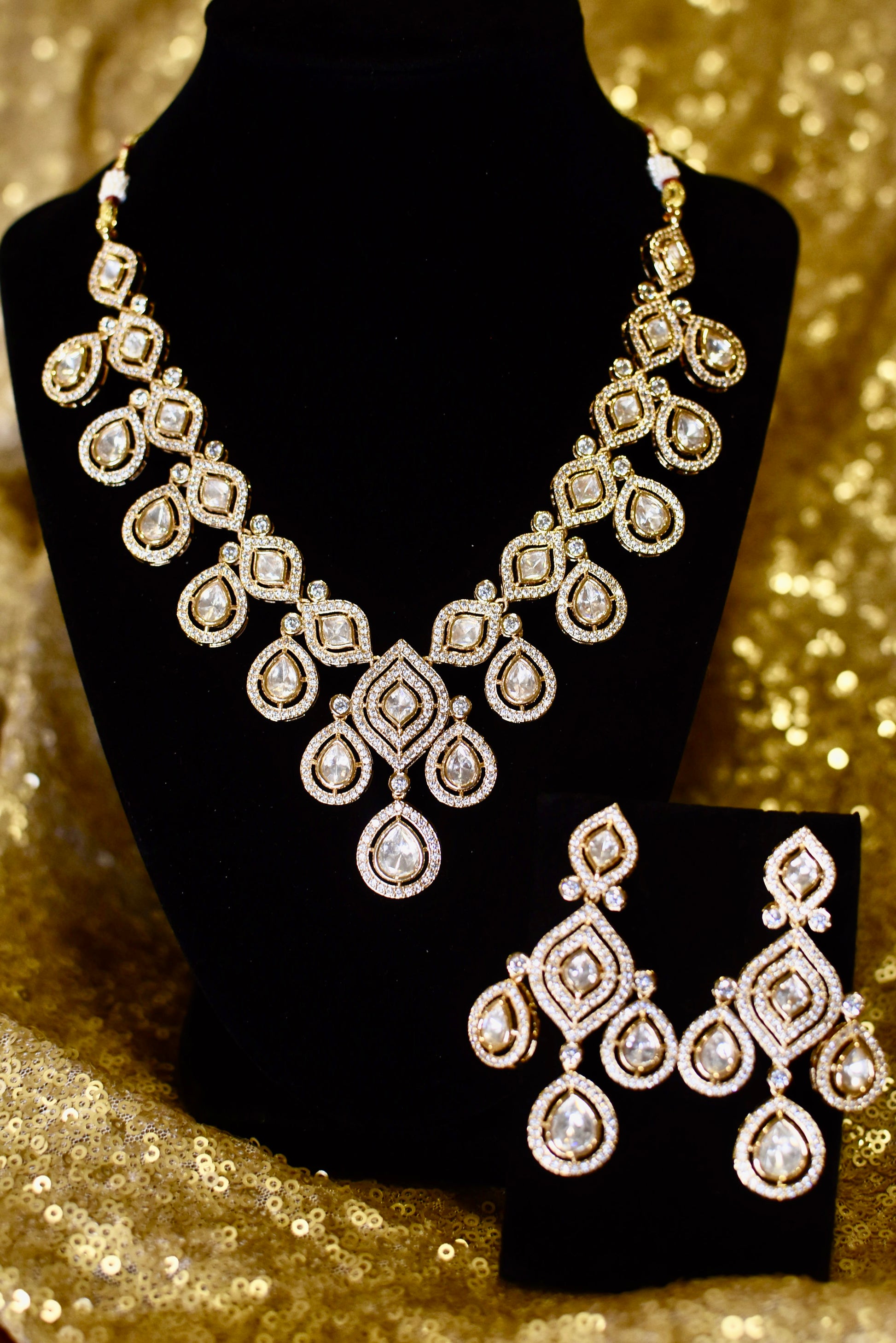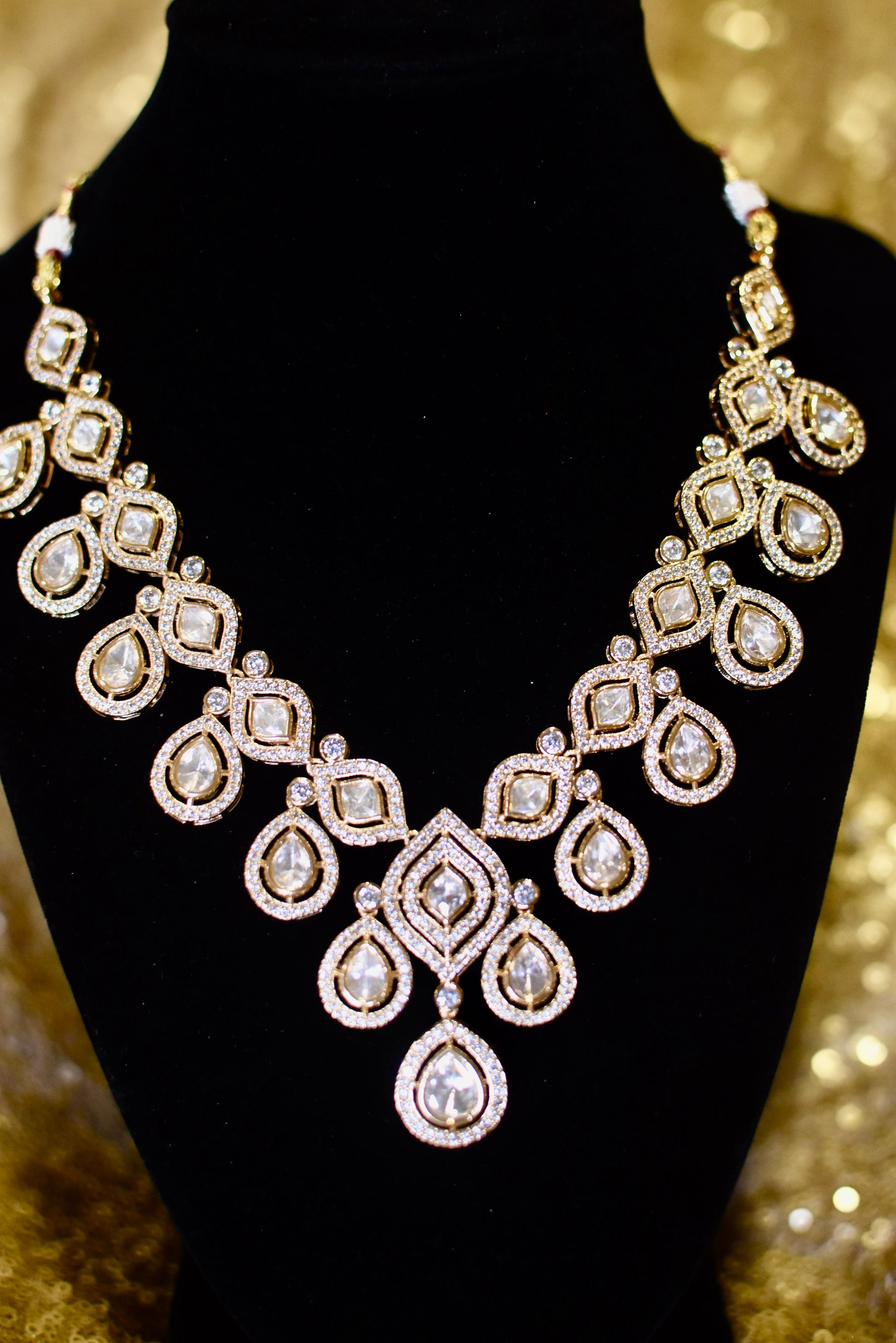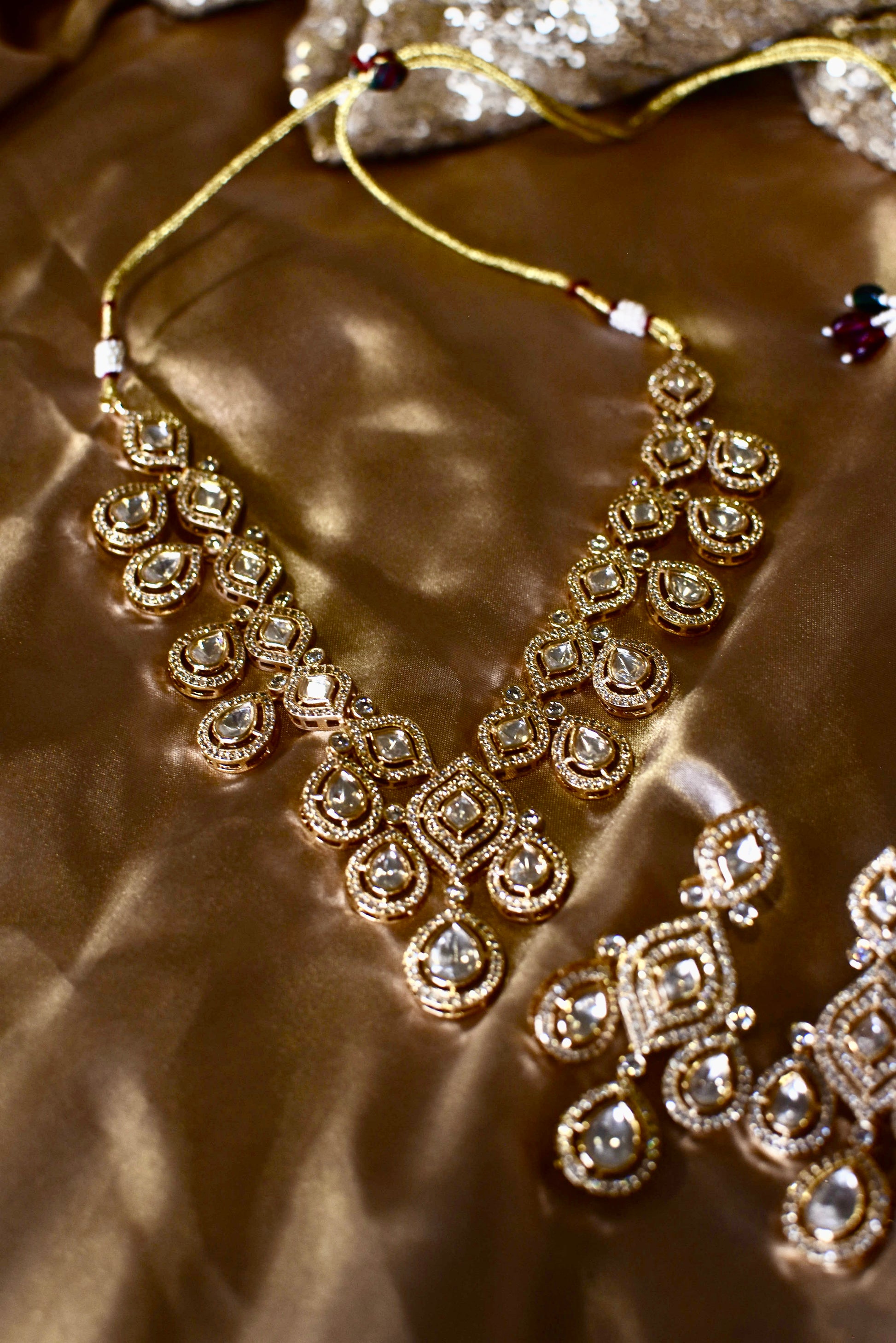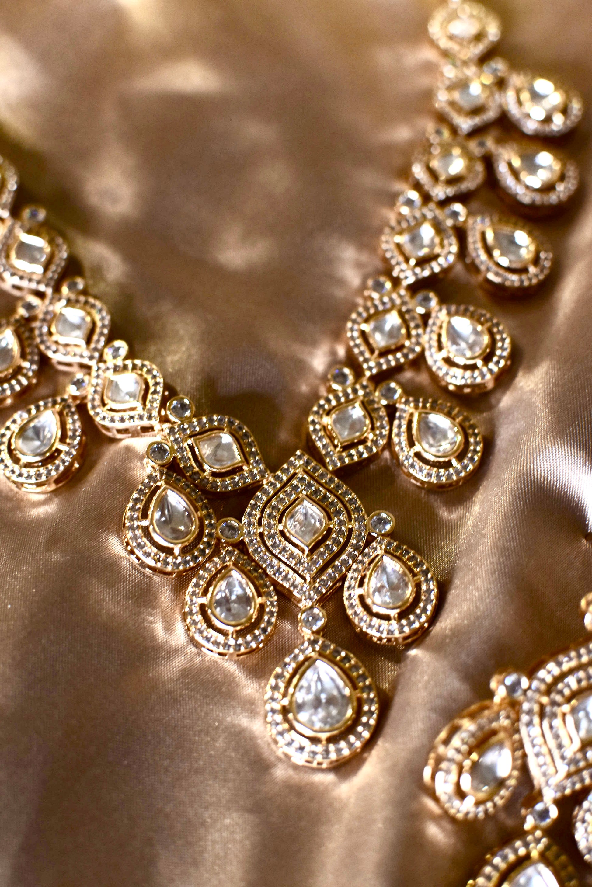 This heirloom-style set features mirror-polished polki-style stones framed in hand-placed pavé crystals and cast in a high-luxury gold finish. Each motif flows into the next — from the double-layered teardrops to the signature Mughal paisley silhouettes, creating a cascading effect that illuminates the neckline with every movement.