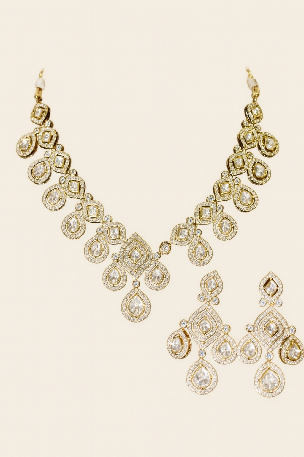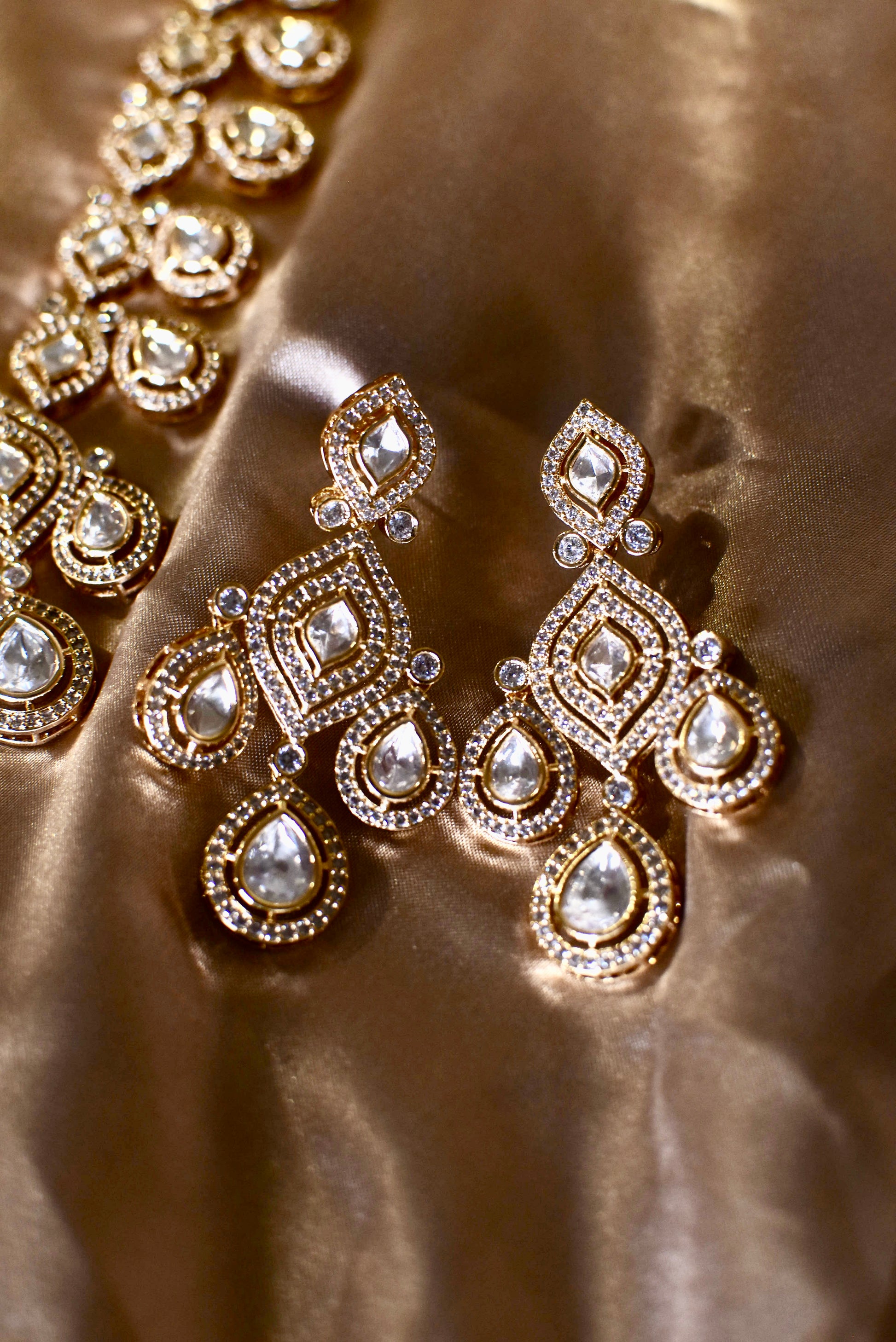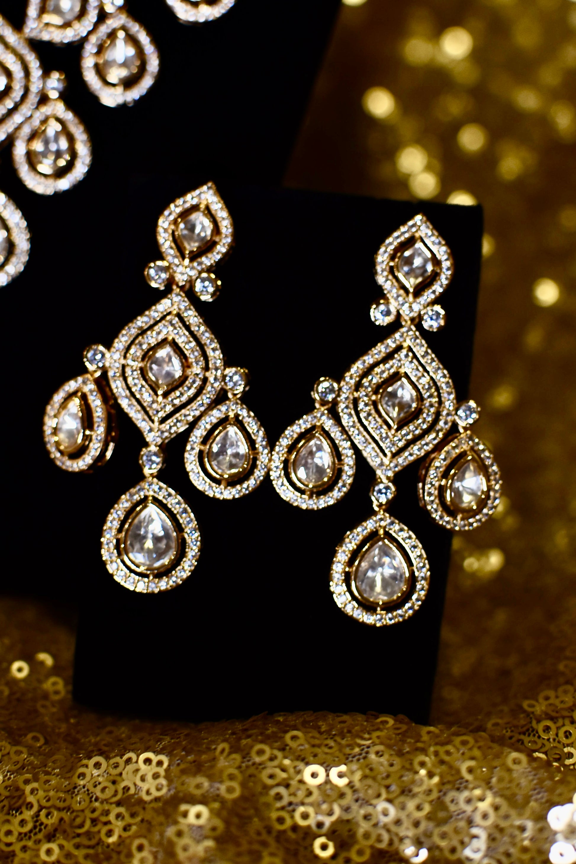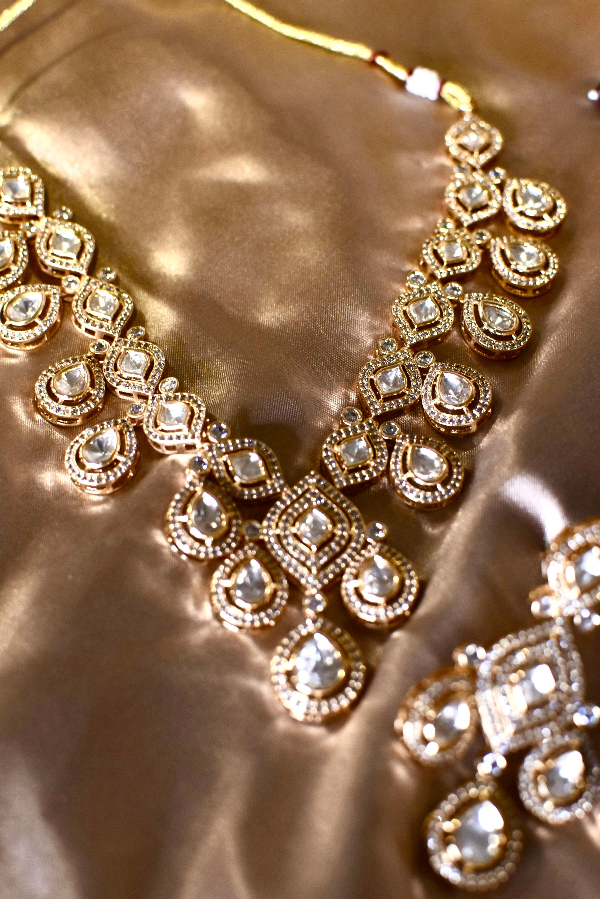 This heirloom-style set features mirror-polished polki-style stones framed in hand-placed pavé crystals and cast in a high-luxury gold finish. Each motif flows into the next — from the double-layered teardrops to the signature Mughal paisley silhouettes, creating a cascading effect that illuminates the neckline with every movement.