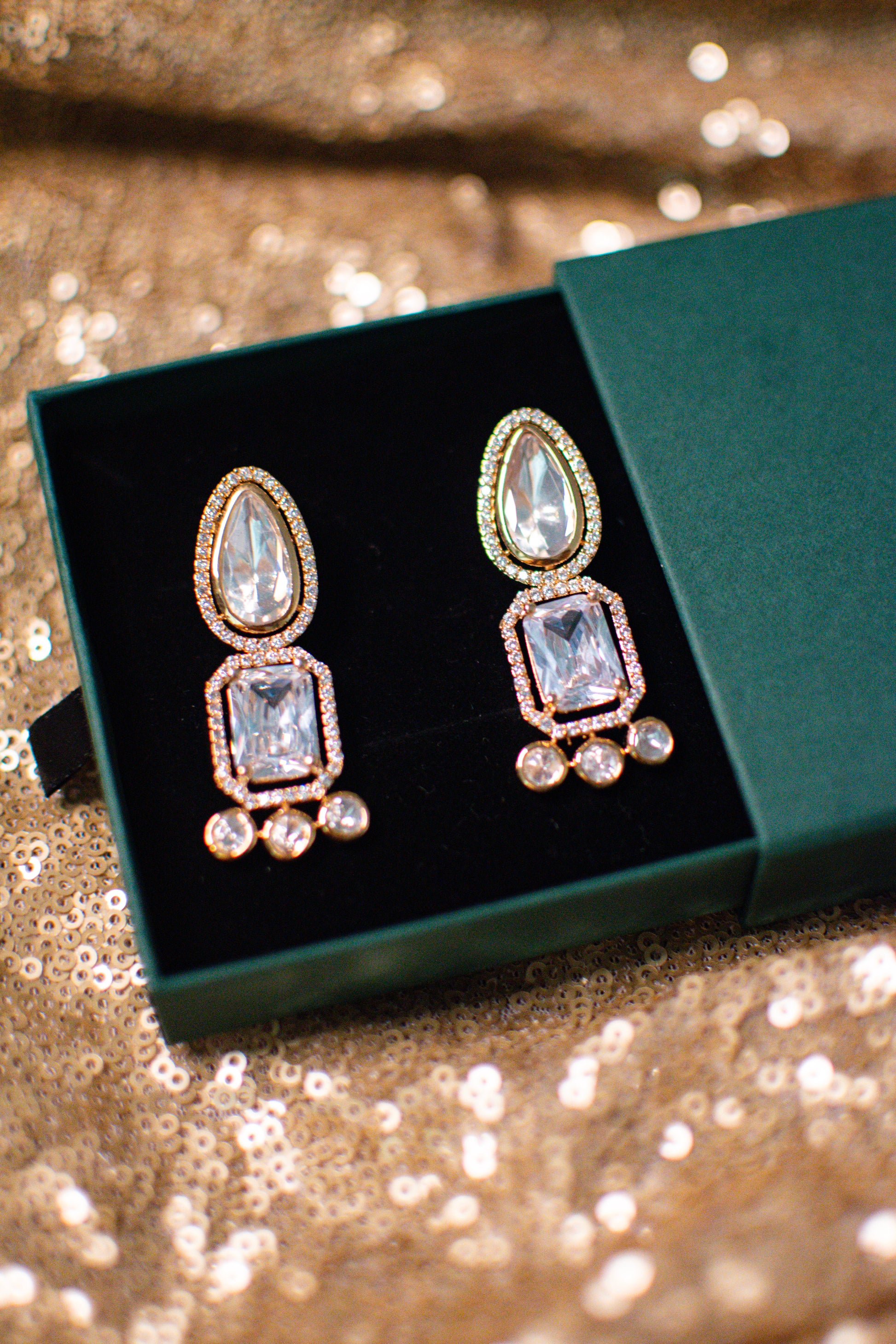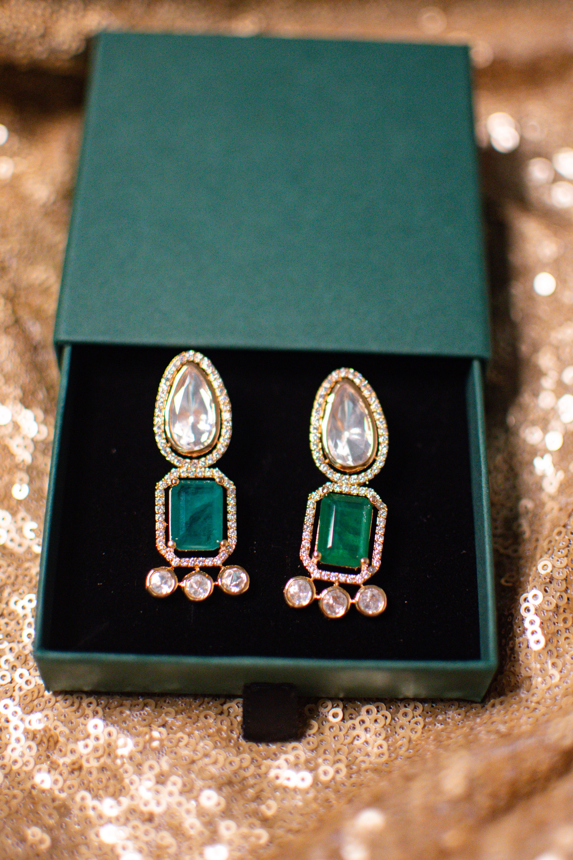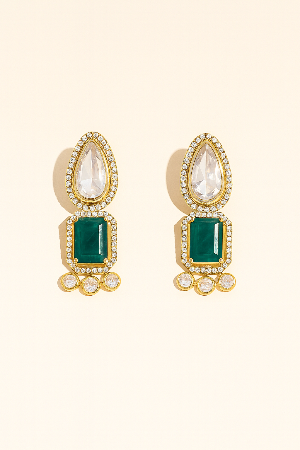 Featuring a striking combination of a teardrop crystal, a bold rectangular centerpiece, and delicate round accents, Zeenat is designed to shimmer with every movement. Available in classic White, deep Emerald, and soft Pink, this versatile piece complements both festive ensembles and contemporary looks.