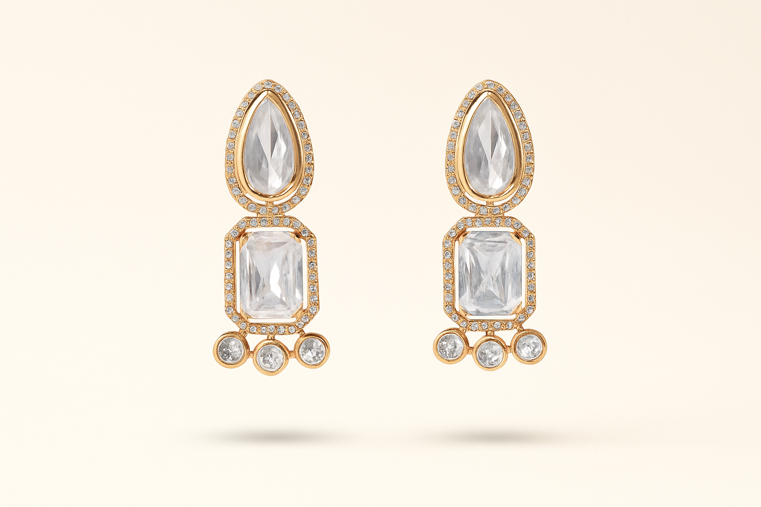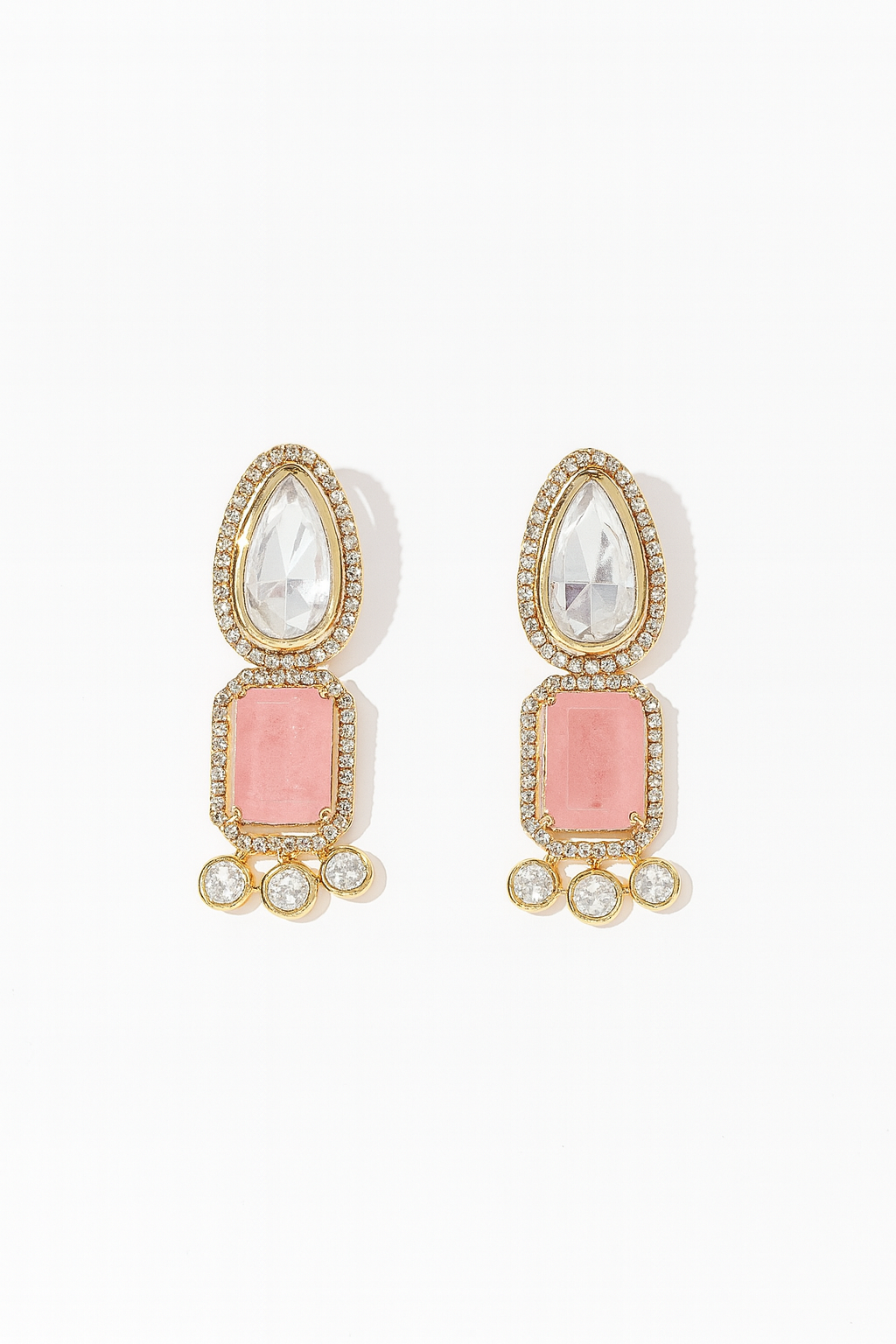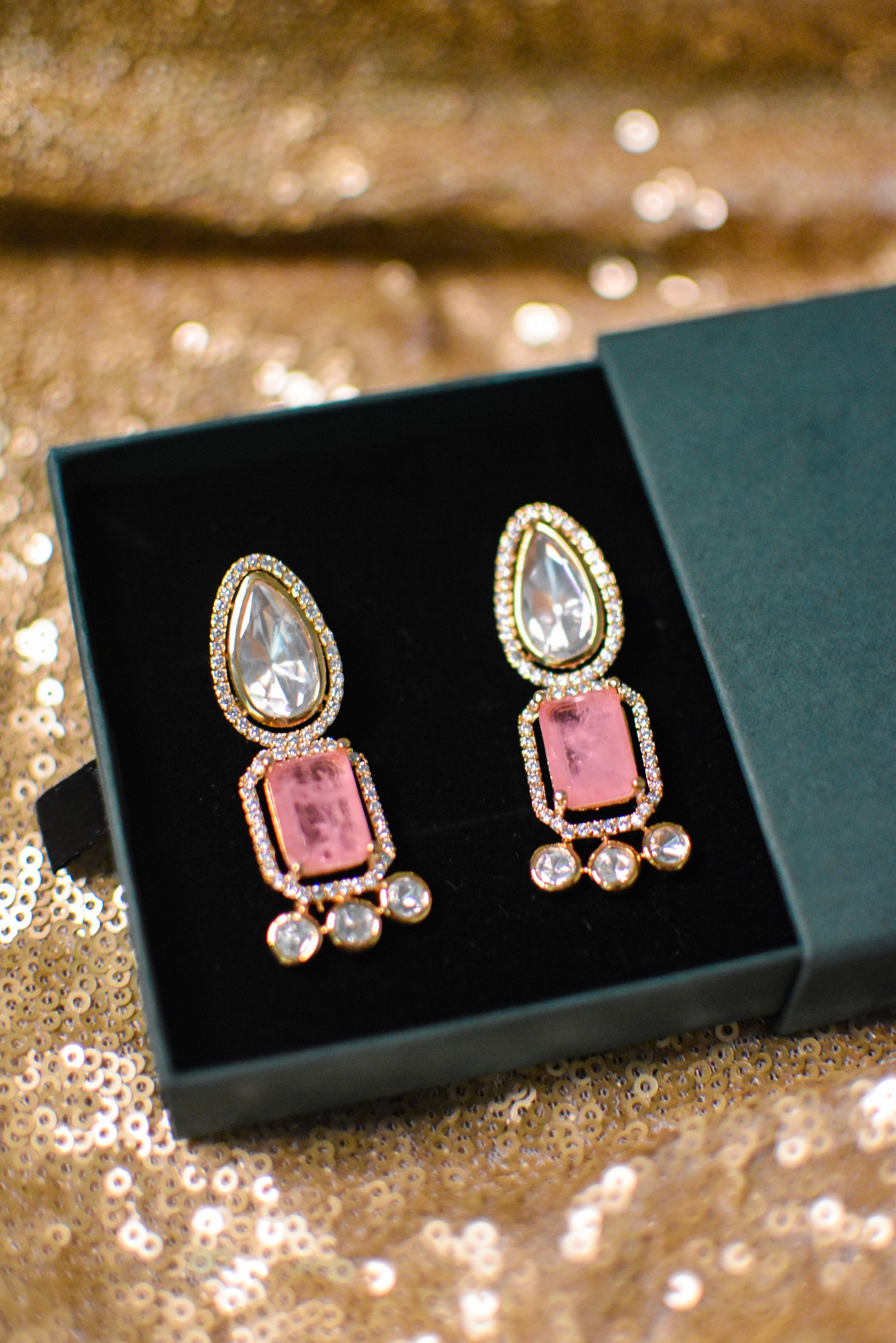 Featuring a striking combination of a teardrop crystal, a bold rectangular centerpiece, and delicate round accents, Zeenat is designed to shimmer with every movement. Available in classic White, deep Emerald, and soft Pink, this versatile piece complements both festive ensembles and contemporary looks.